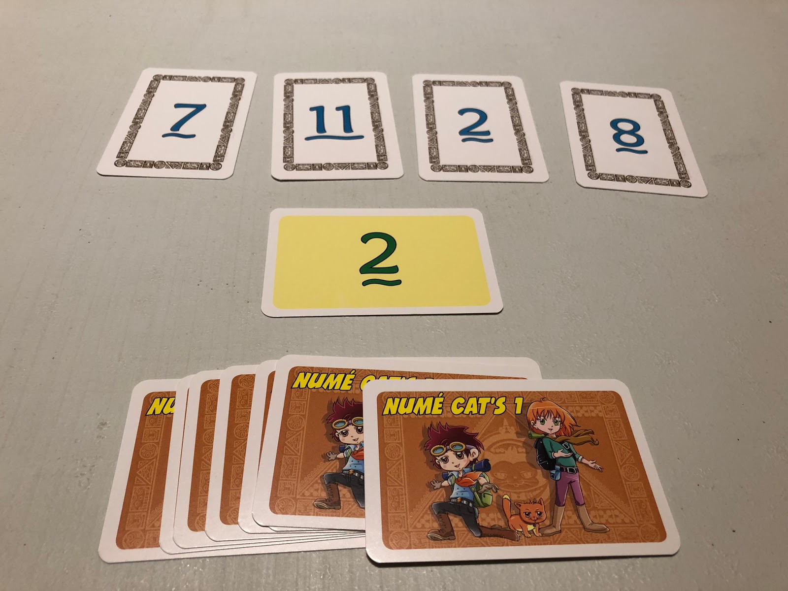 Alors celui-là, Numé Cat’s (Les énigmes mathématiques) a reçu la médaille d’or du Concours Lépine en 2009. Un jeu de cartes pour les petits et les grands qui a fait travailler nos méninges comme pas permis… Plusieurs règles proposées, nous en avons testées plusieurs (on a vraiment bien accroché, c’était l’un de nos favoris). Comme sur l’image plus haut, posez 4 cartes qui vous permettront de faire votre calcul (en blanc) et une qui sera le résultat (en jaune). Ensuite, silence, et faites travailler vos neuronnes pour révéler le calcul qui vous mènera à ce résultat ! Vous n’êtes pas obligé d’utiliser toutes les cartes pour réaliser le calcul. Ici : 7+11 =18. 2*8 = 16. 18-16 = 2. Fastoche !