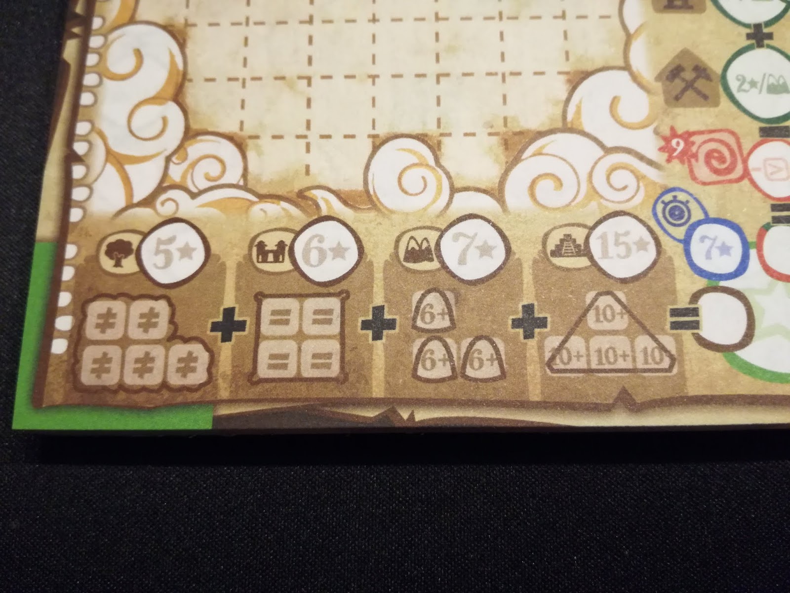 En fin de partie, vous gagnerez : 5 points / Forêt ; 6 points / Ville ; 7 points / Montagne et finalement 15 points / Pyramide. A ça, on ajoute les bonus des bâtiments, les points négatifs donnés par les serpents et ainsi que 7 points de victoire si vous avez réussi à compléter votre fiche.