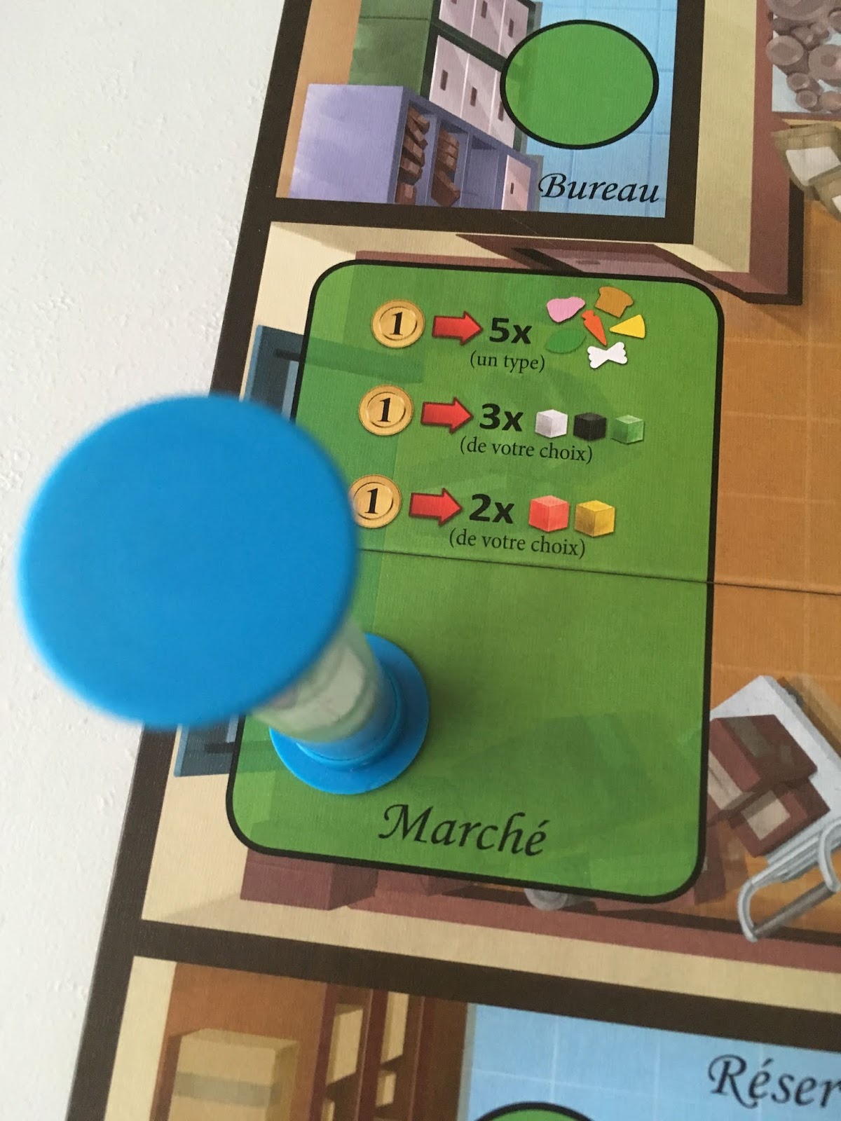 Permet de prendre des ingrédients disponibles dans la réserve où vous posez votre sablier. Ces ingrédients peuvent être placés sur des assiettes (un ou plusieurs) présentes sur votre plateau individuel mais uniquement ceux au niveau de cuisson 0. Tant que vous avez un sablier dans la réserve, vous pouvez y prendre des ingrédients donc même lorsque celle-ci est réapprovisionnée par une action marché.