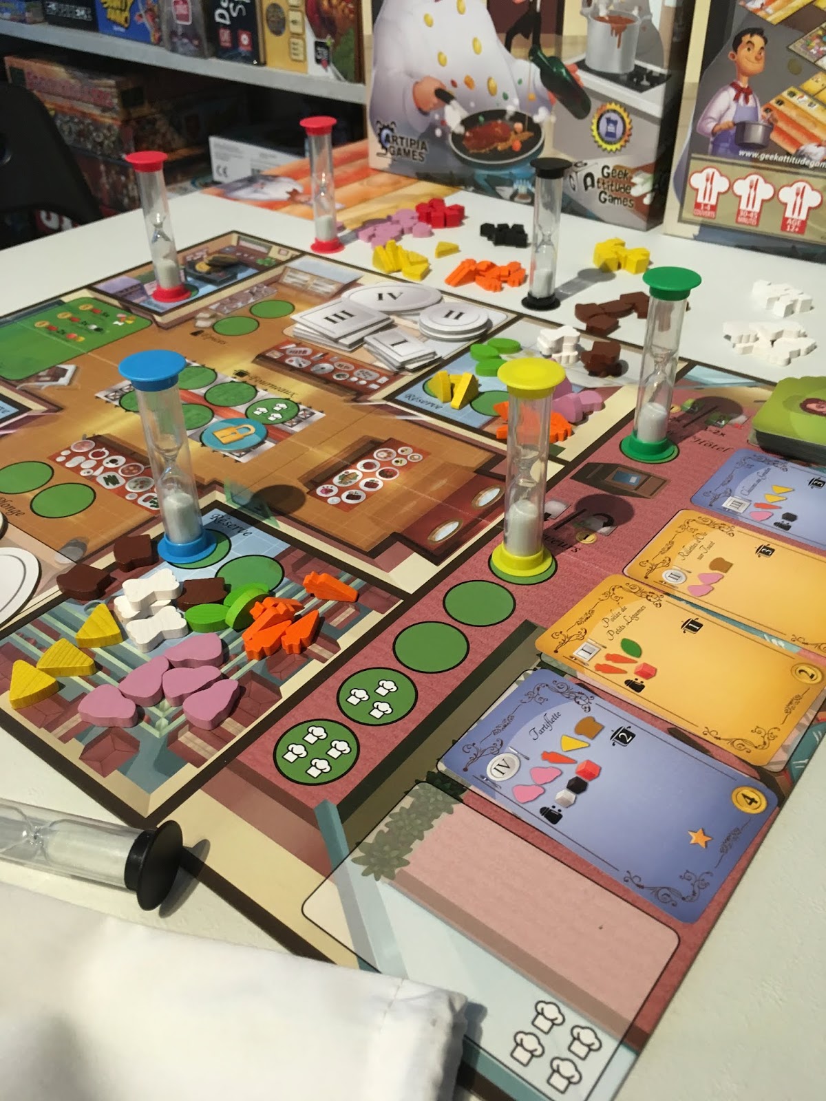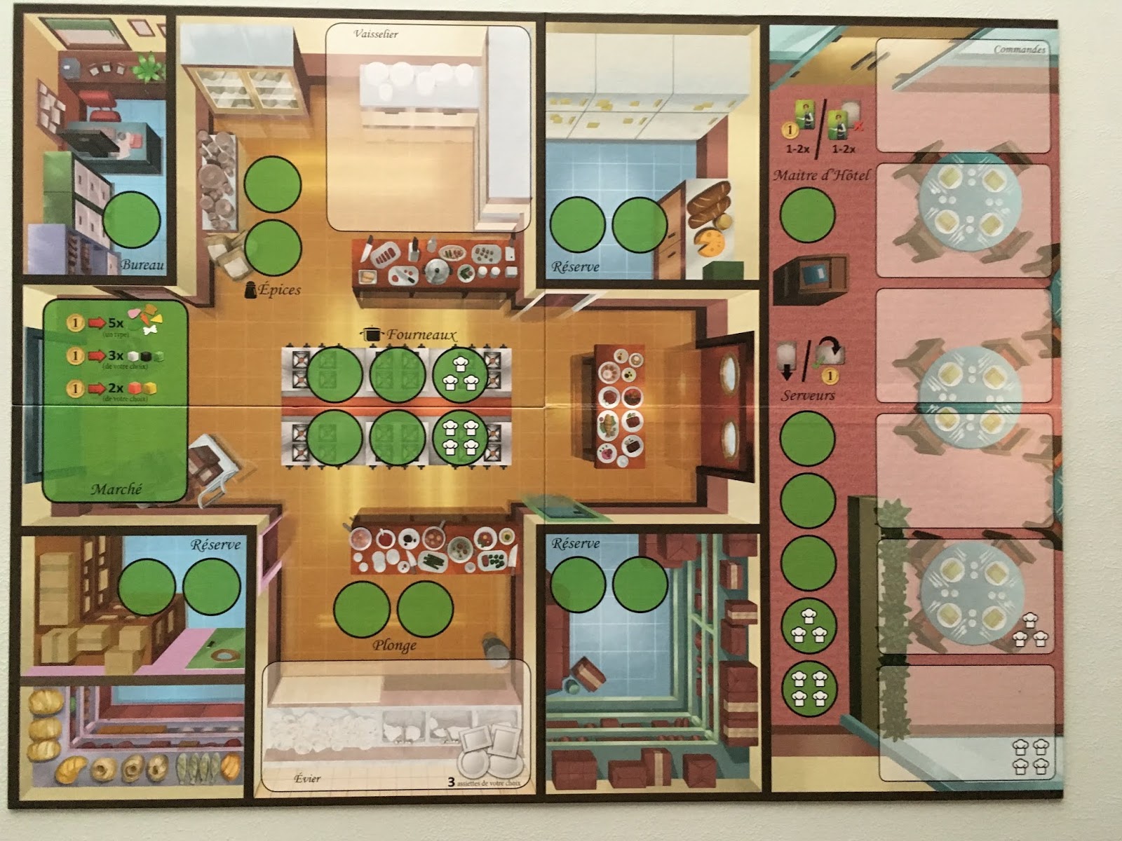 Le jeu se compose d’un plateau commun qui représente un restaurant (et principalement sa cuisine) où vous allez réaliser les différentes actions possibles.