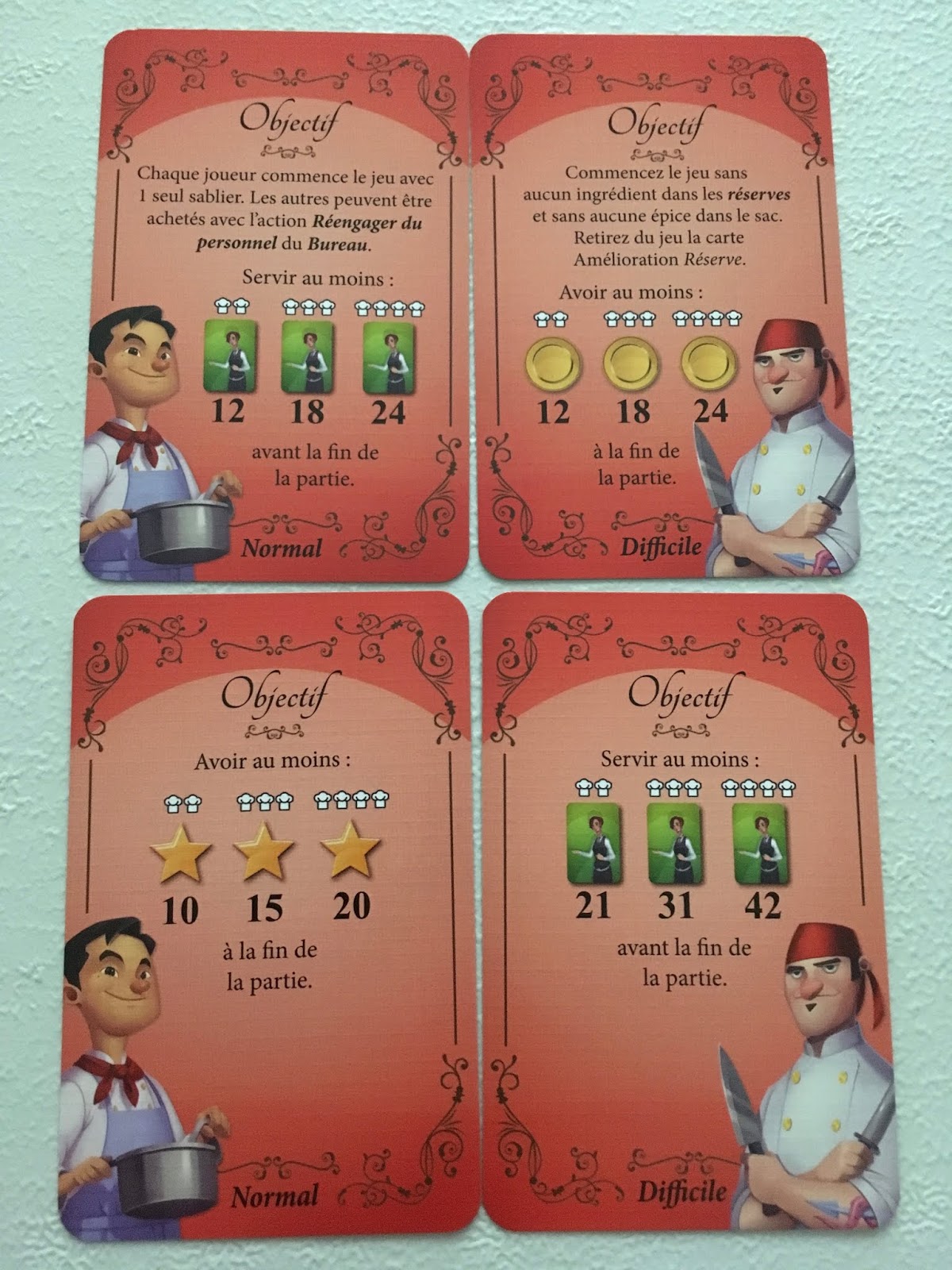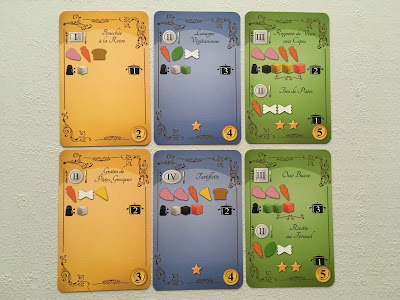 – Si c’est correct, l’équipe reçoit les récompenses indiquées sur la carte (sous + prestige). Les ingrédients et épices sont replacés en dehors du plateau de jeu, les assiettes à la plonge et la carte conservée pour le décompte de fin de partie.