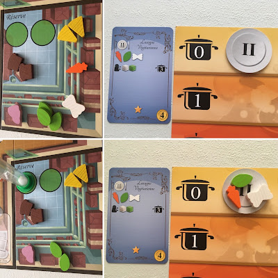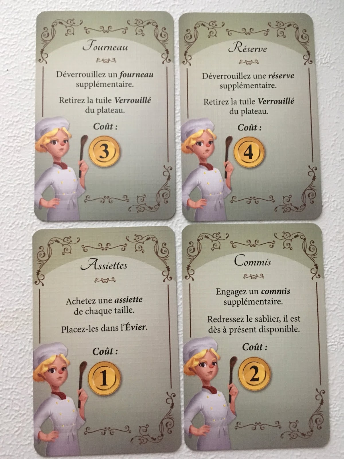 – Améliorer la cuisine : payez le prix indiqué sur une des 2 cartes Amélioration disponibles face visible et bénéficiez immédiatement de son bonus (nouvelles assiettes / fourneau supplémentaire / second commis ou nouvelle réserve avec ingrédients accessibles). Retirez ensuite la carte et remplacez là par une autre (4 au total).
