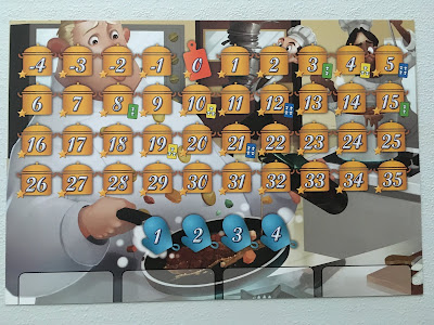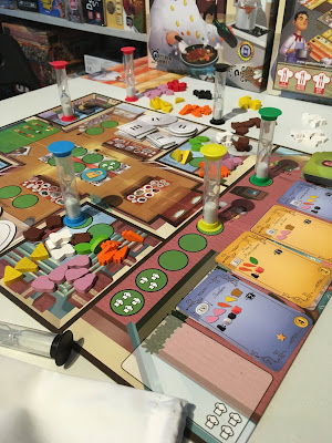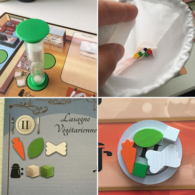 Avant d’attaquer la première manche, il faut réaliser la mise en place en fonction du nombre de joueurs. Chacun reçoit un plateau individuel et 2 sabliers. Les différents ingrédients et épices sont installés à côté du plateau de jeu (et certains sont accessibles dès la première manche sur le plateau). On choisit son objectif (je vous en parle plus loin). Les différentes cartes sont placées. Certaines zones du plateau sont bloquées (et pourront donc être débloquées durant la partie) ou sont inaccessibles pour l’ensemble de la partie (toujours en fonction du nombre de joueurs).