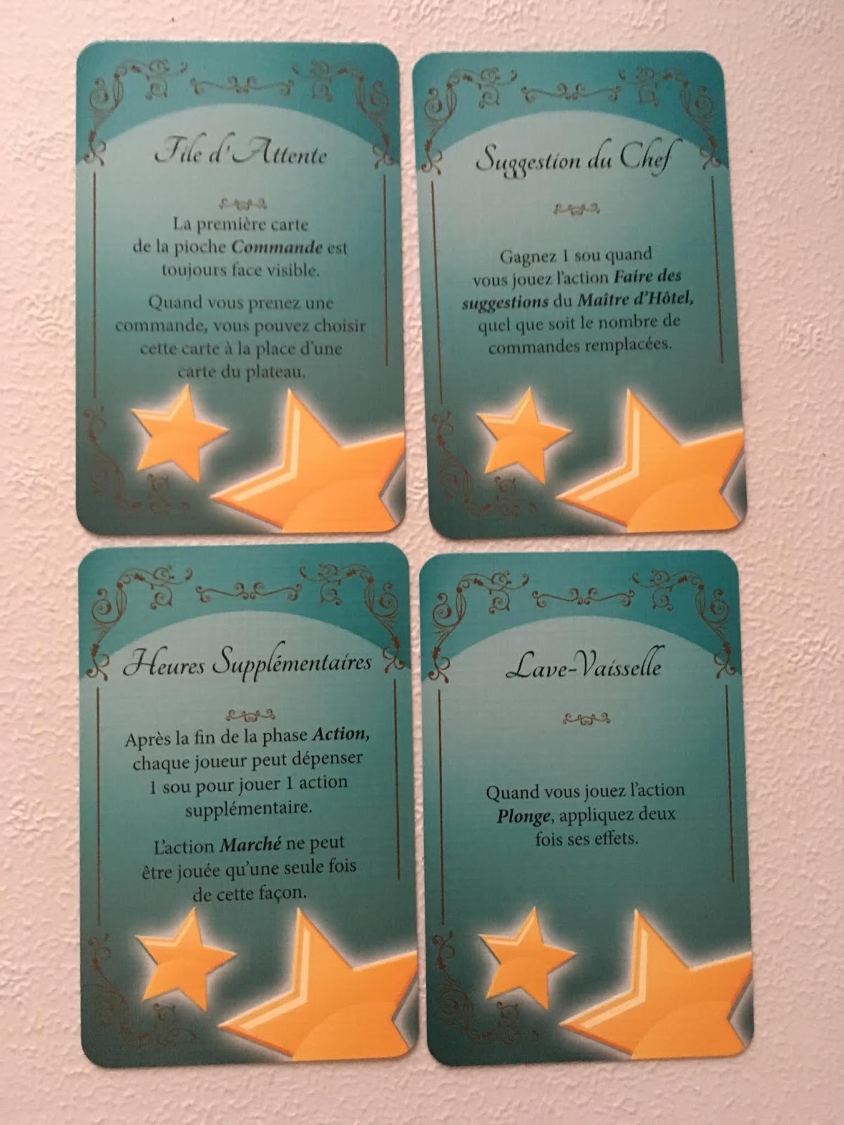 – Faire un service rapide : une Commande préparée est automatiquement servie durant la phase de maintenance. Cependant, pour gagner de l’argent, vous pouvez envoyer un plat via le service rapide. Pour ce faire, on place un sablier, on incline la carte du plat envoyé et on prend un sou qu’on met dans le bureau (pourboire du client ravi d’avoir été servi si rapidement).