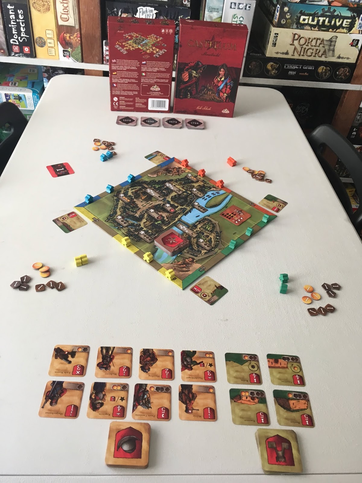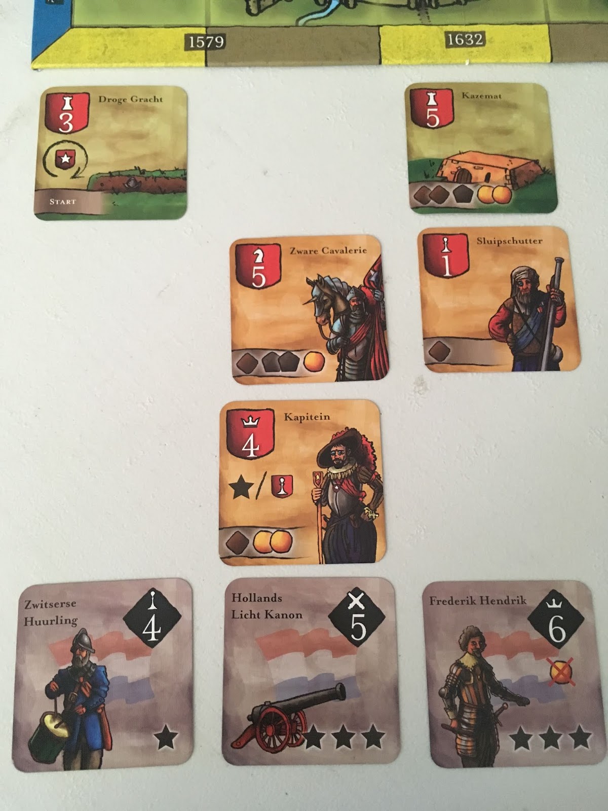 Les cartes Troupe, Fortification et Ennemi (différentes années séparément) sont mélangées et placées à coté du plateau.