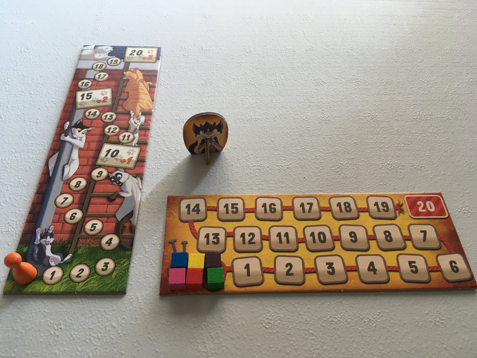 Chaque joueur choisit le chat qu’il incarnera et prend le cube coloré correspondant, il place ensuite celui-ci sur le zéro de la piste de score.