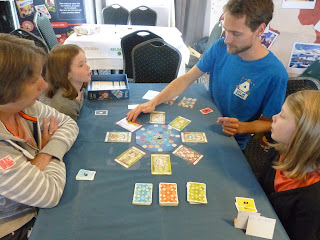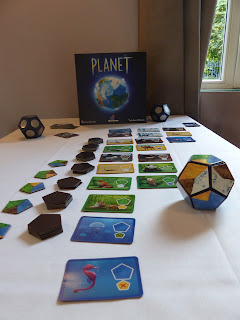 Toujours, chez Geronimo, j’ai pu découvrir Planet qui sortira bientôt chez Blue Orange. Au premier coup d’œil, le matériel attire ! Le jeu propose une collecte de tuiles afin de créer une planète idéale pour la vie de plusieurs espèces animales. Et bien sûr, la planète est en 3 dimensions avec des plaquettes aimantées afin de pouvoir y placer les tuiles que l’on récupère. Le but étant de remplir différents objectifs au fil des tours en plaçant les bons types de terrains sur notre planète. Je n’ai pas pu faire de partie mais le jeu a très bien tourné toute la journée, et semblait très bien fonctionner quel que soit le public. Encore une sortie que je suivrai avec attention.