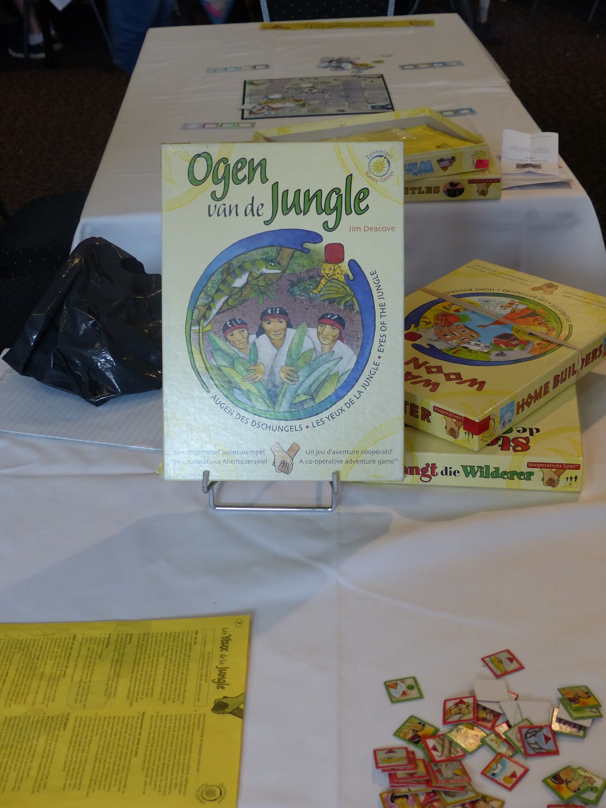 Après ces deux jeux, il était temps de changer un peu de stand, je me suis donc retrouvé au sous-sol, parmi les associations. L’une d’entre-elles (l’académie citoyenne BAO-Jeunesse) proposait des jeux coopératifs d’un éditeur néerlandais que je ne connaissais pas : Sunny Games. Le temps d’attendre des partenaires de jeux et je me suis lancé dans Les Yeux de la jungle. Léger mais tout de même agréable à jouer malgré des illustrations assez vieillottes (le jeu date de 1991, c’est normal). On s’est bien amusés et la victoire était à la clé. J’ai ensuite discuté un bon moment avec les membres de cette association qui propose de l’éducation par le jeu (entre autres). Je vous en parle plus en détail un peu plus bas.