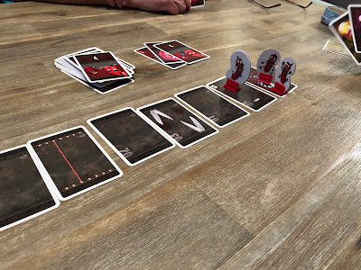 La mise en placeL’installation se fait très rapidement : vous installez les 8 cartes tapis roulant les unes à la suite des autres (vous pouvez choisir la face, les différents décors et machine à broyer/griller ne sont qu’illustratives) et mettez au bout du dit tapis la Machine à Viande (qui elle n’est pas illustrative)