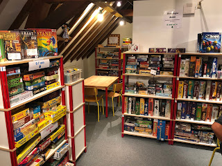Une fois les formalités terminées, vous avez un accès aux jeux de la ludothèque mais également et surtout, le club met en avant plusieurs nouveautés (une pour chaque différent public : famille/gamer/hard gamer + un jeu encore « sous la loupe ») fournies par leur sponsor le webshop Golden Meeple. Il y a encore parfois des auteurs en invités.