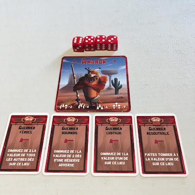 A 2 joueurs, vous jouez avec 3 lieux. A chaque fois qu’un totem est placé, si celui-ci porte un tomahawk en bas, vous lancez un dés d’une couleur non utilisée et vous le placez sur le lieu à coté de ce totem. Ces dés sont ceux d’un joueur virtuel dont il faudra tenir compte lors du décompte de chaque lieu.