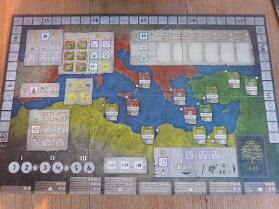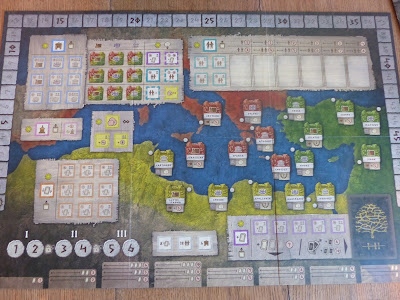 Nous nous retrouvons sur les bords de la Méditerranée, magnifiquement illustrée sur le plateau central. Celui-ci est recto-verso et on choisira donc le côté en fonction du nombre de joueurs.