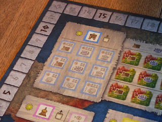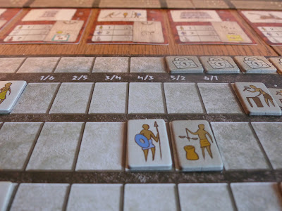 Sur ce plateau, plusieurs types d’emplacements sont prévus : les plus nombreux accueilleront les tuiles permettant d’effectuer la plupart des actions, un espace est destiné au tuiles représentant les citoyens que l’on pourra recruter tout au long de la partie et enfin, une zone où l’on pourra disposer les carte Civilisation qui nous permettront de bâtir toutes sortes de bâtiments.