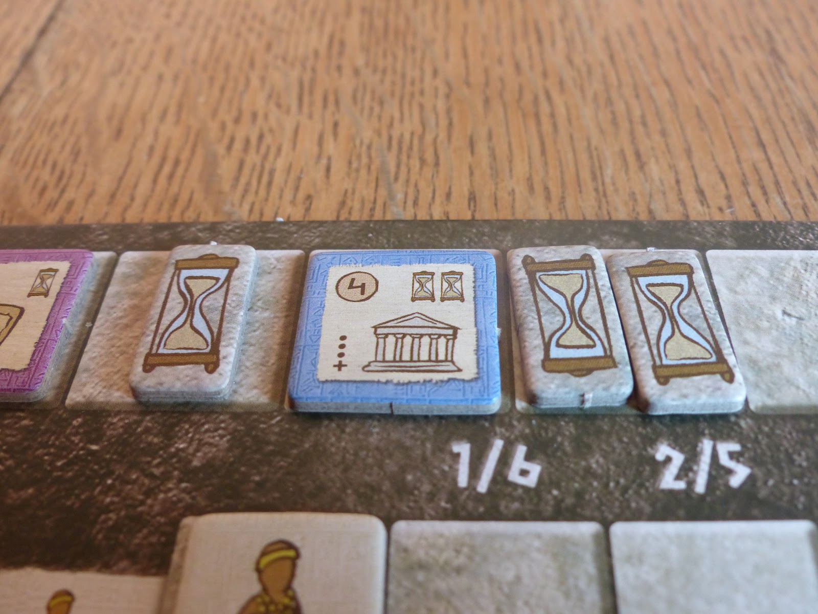 C’est l’action qui sera la plus employée. Pour cela, on doit payer exactement le coût indiqué sur la tuile (ça aura son importance par la suite). On prend alors la tuile que l’on place sur notre ligne du temps. On ajoute ensuite autant de sabliers que représenté sur la tuile prise.