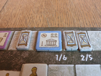 La tuile est posée sur la ligne du temps. On doit donc payer 6 pièces et placer un sablier pour effectuer l’action Scribe. |