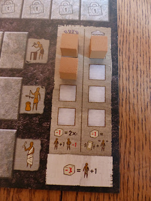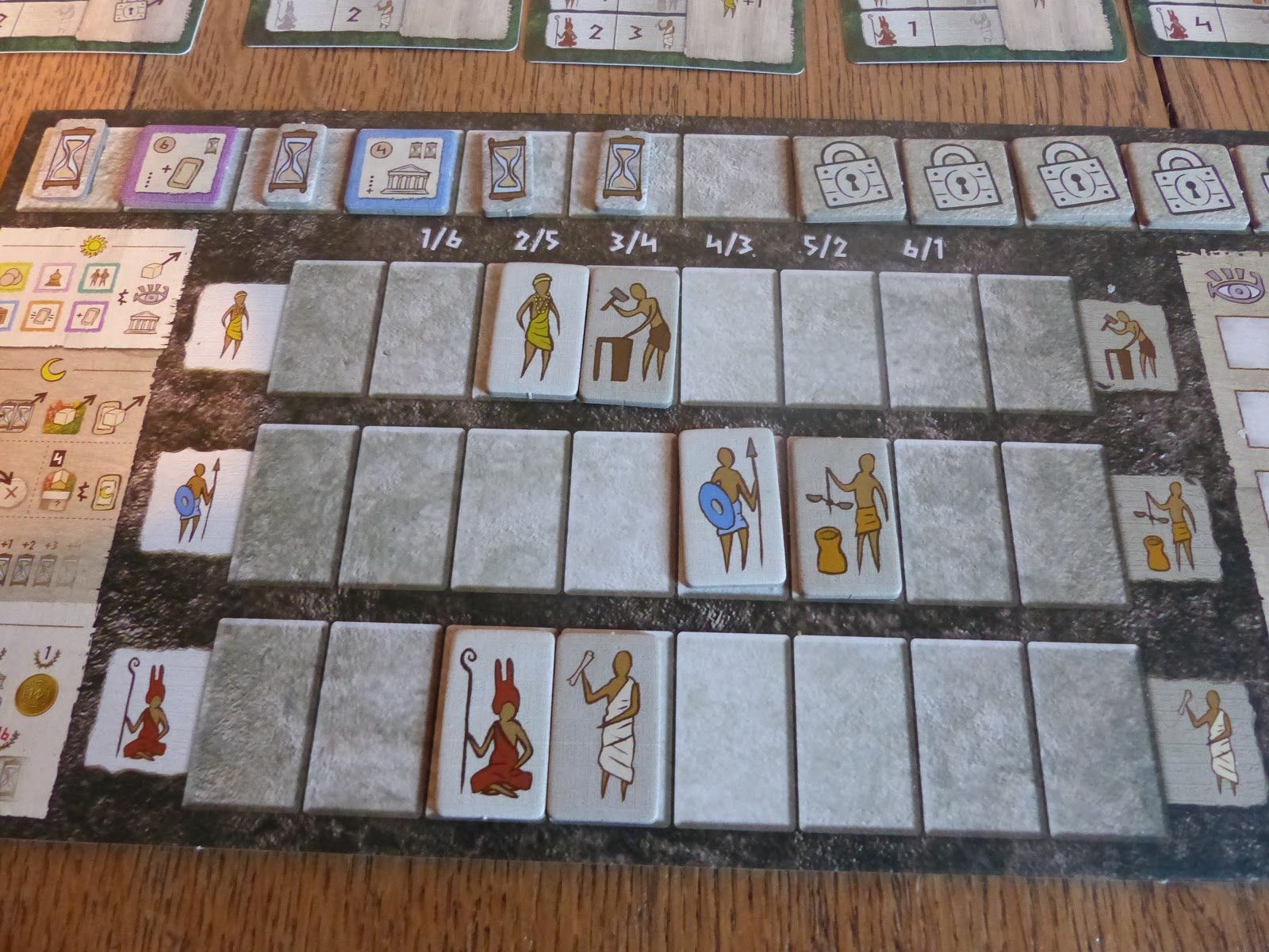 Aussi présent sur notre plateau individuel, un tableau permettant de distinguer les différents types de citoyens de notre peuple : sur chaque ligne, on trouve deux professions qui se font face : les nobles et les artisans, les soldats et les marchands et enfin les prêtres et les nobles.