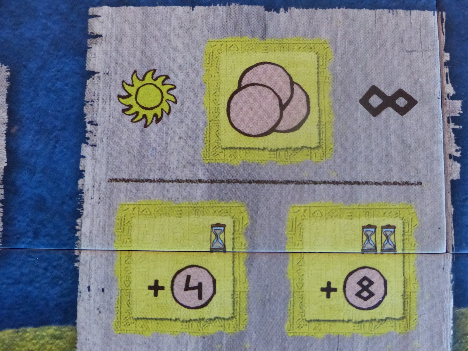 Ces actions peuvent être effectuées à deux endroits : soit sur une de nos cartes Civilisations, soit auprès d’une de nos cités du Foyer. Il s’agit en fait d’une action supplémentaire que l’on peut activer une fois par manche, en y plaçant un cube indicateur. Il faut bien entendu payer le coût correspondant et ajouter des sabliers sur notre ligne du temps, mais il n’y a pas de tuile à y mettre. On gagne donc du temps et de l’argent ! Et comme ces actions sont juste pour nous, on ne doit pas trop s’inquiéter de voir la tuile dont on a besoin être prise par les adversaires !