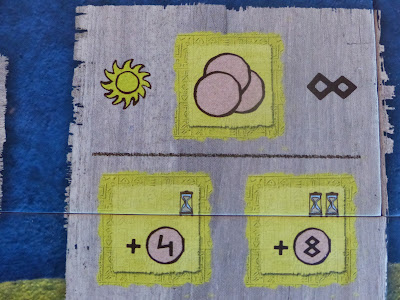 La plupart des actions que nous ferons nous demanderont de placer un certain nombre de sabliers sur notre ligne du temps (de 1 à 3). Pour ce faire, on prend autant de sabliers dans la réserve générale et on va les placer sur les prochaines cases libres de notre ligne du temps. Si on doit placer plusieurs sabliers, on aura le choix de les regrouper (jusqu’à deux par case) ou de n’en mettre qu’un par case. Cette décision est très importante vu qu’elle aura un impact sur le nombre d’actions que vous pourrez effectuer lors de chaque ère : en regroupant les sabliers, vous aurez plus de temps lors de cette manche mais vous en perdrez à la suivante (voir la phase de déclin un peu plus bas) alors que si vous les séparez, c’est pendant la manche en cours que vous perdrez des actions. Et on ne pourra plus ajouter de sablier sur une case sur laquelle on en avait déjà placé un lors d’un tour précédent.