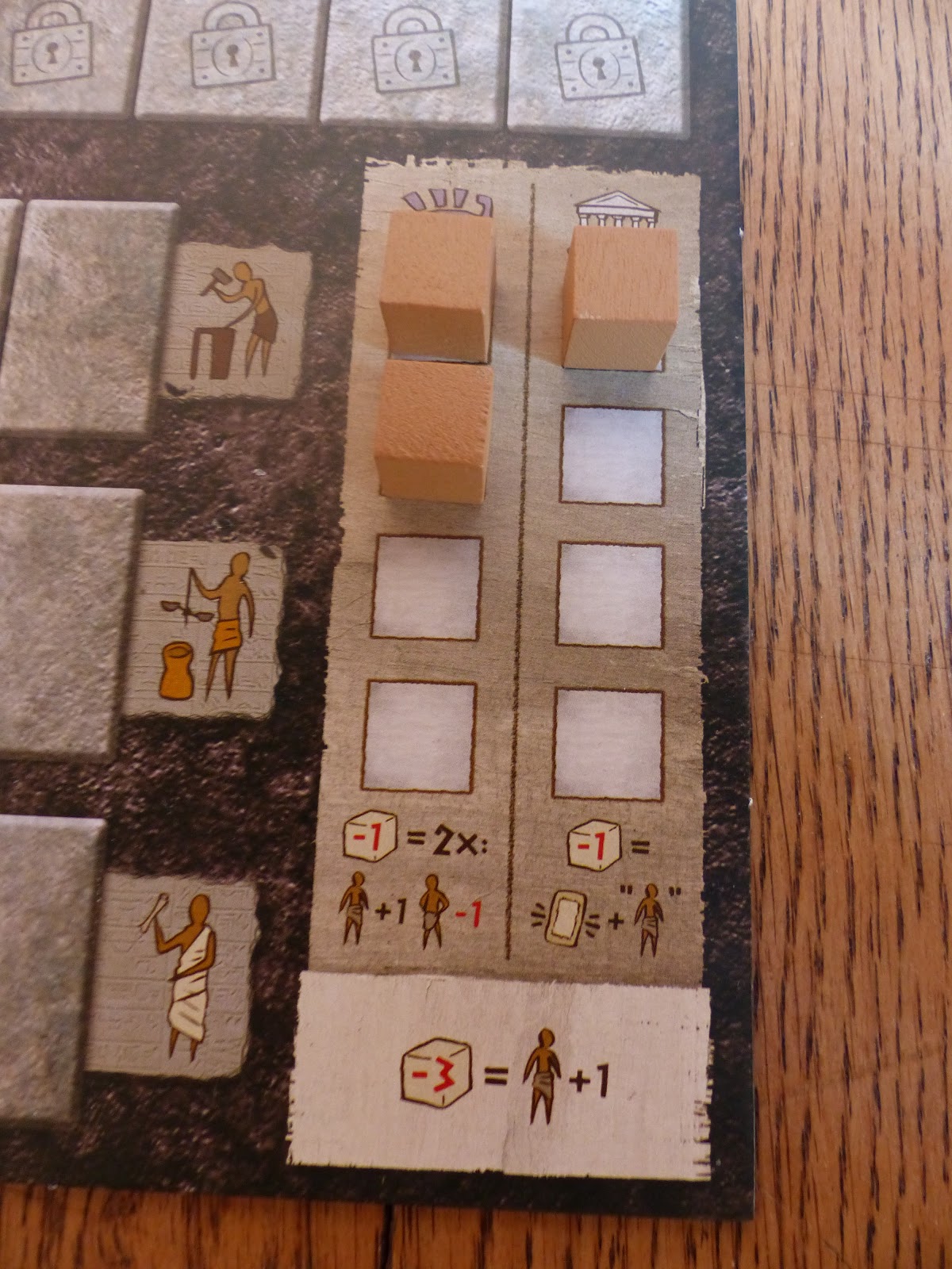 En défaussant un cube de la colonne de droite, on peut placer une carte Civilisation en ayant besoin d’un citoyen en moins (de n’importe quel type).