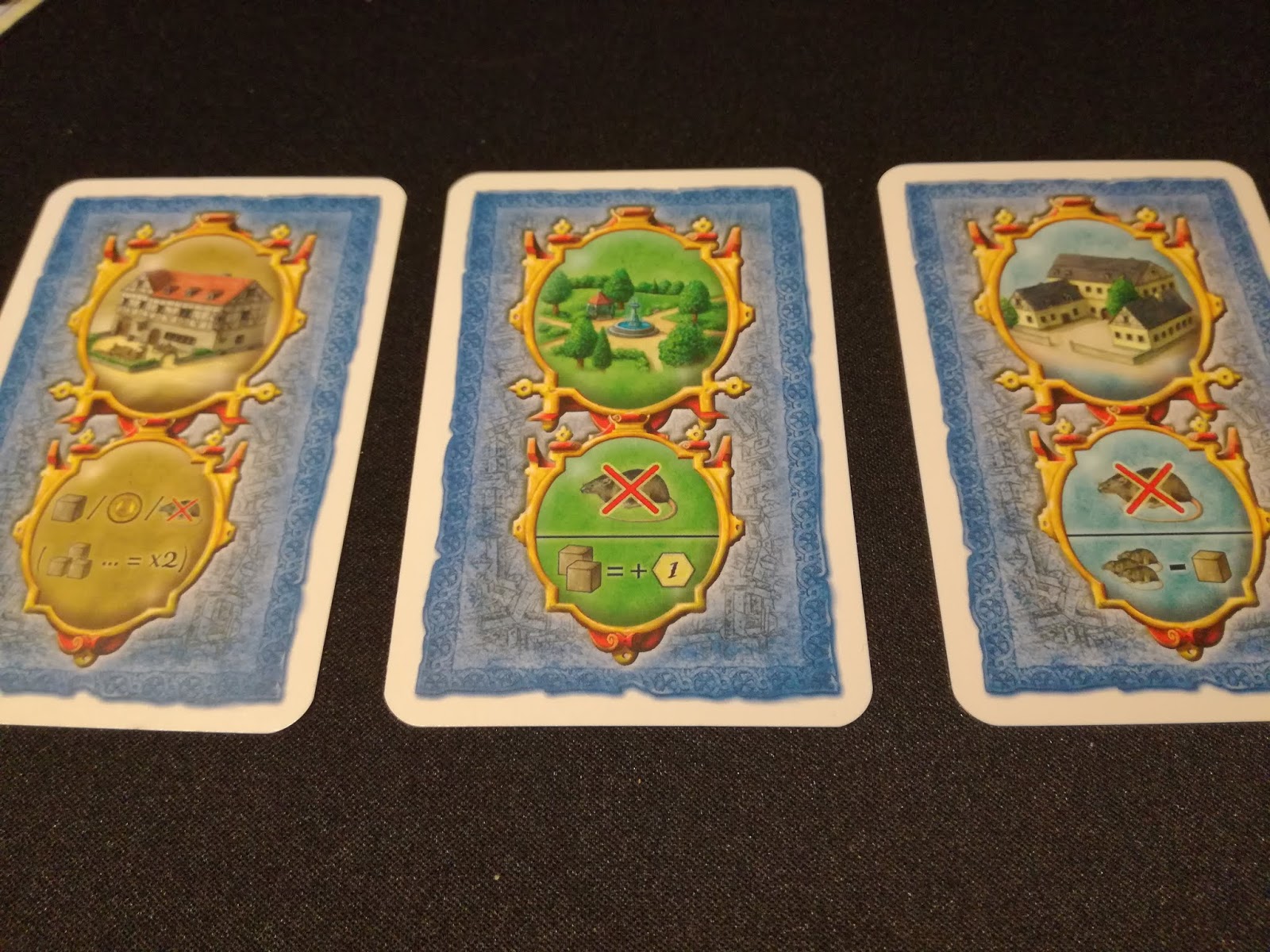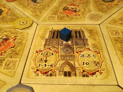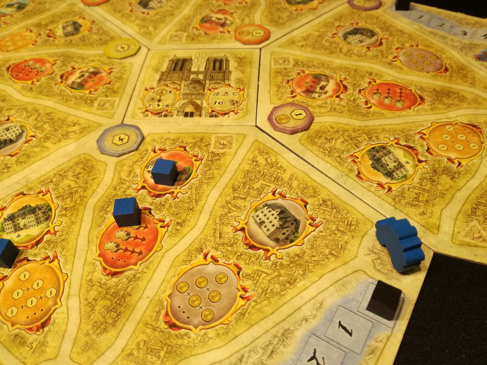 Exemple : Ci-dessous, je suis seul sur la Cathédrale à la fin de la manche A, je gagne donc 10 PV’s. Si j’y avais placé 2 cubes et un autre joueur 1 cube, il y aurait eu donc 3 cubes (bien vu). Du coup, les 10 PV’s auraient été divisés par 3 et CHAQUE CUBE aurait valu 3 PV’s.