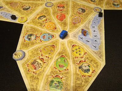 La calèche : votre calèche débute dans la place centrale de votre quartier. Ensuite, avec 1 cube, vous pourrez vous déplacer vers 1 autre place distante de « 1 », je dirais. Vous pouvez alors y ramasser le token, joliment appelé « Lettre de Noblesse ». Avec 2 cubes, vous vous déplacerez de 2, etc MAIS petite règle additionnelle, il ne vous est pas permis de ramasser une seconde Lettre de Noblesse de la même couleur tant que vous n’avez réuni pas un set complet composé de chaque couleur.