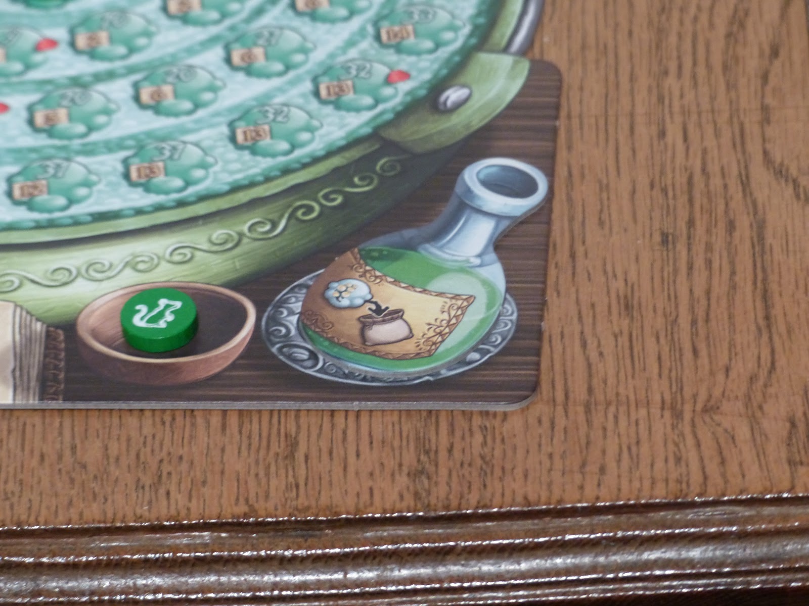 J’avais volontairement passé la deuxième étape lors de mon explication. Il s’agit des queues de rats. Pour les joueurs menés au score, il est possible d’utiliser des queues de rats pour épaissir leur potion dès le départ. On compte donc le nombre de queues de rats qui les séparent du premier joueur sur la piste de score et ils peuvent placer leur jeton rat à autant de cases de leur goutte. Ils commenceront donc un peu plus loin. Cela permet de donner une chance aux joueurs en retard de tenter de rattraper le premier plus facilement.