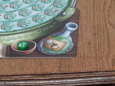 Certains ingrédients procurent des bonus en fin de manche s’ils ont été utilisés. C’est notamment le cas des araignées, qui permettent de recevoir 1 rubis pour chaque araignée placée en dernière ou avant-dernière position dans le chaudron. Si on en a acheté (ou reçu) on résoudra aussi les effets des souffles de fantôme et ceux des Totenkopffalter (non, cela n’a pas été traduit dans la règle mais je l’ai fait pour vous : les papillons de nuit avec une tête de mort – ou quelque chose dans ce genre là… Mais bon le mot allemand étant particulièrement facile à retenir et à prononcer, je comprends qu’il ait été gardé).
