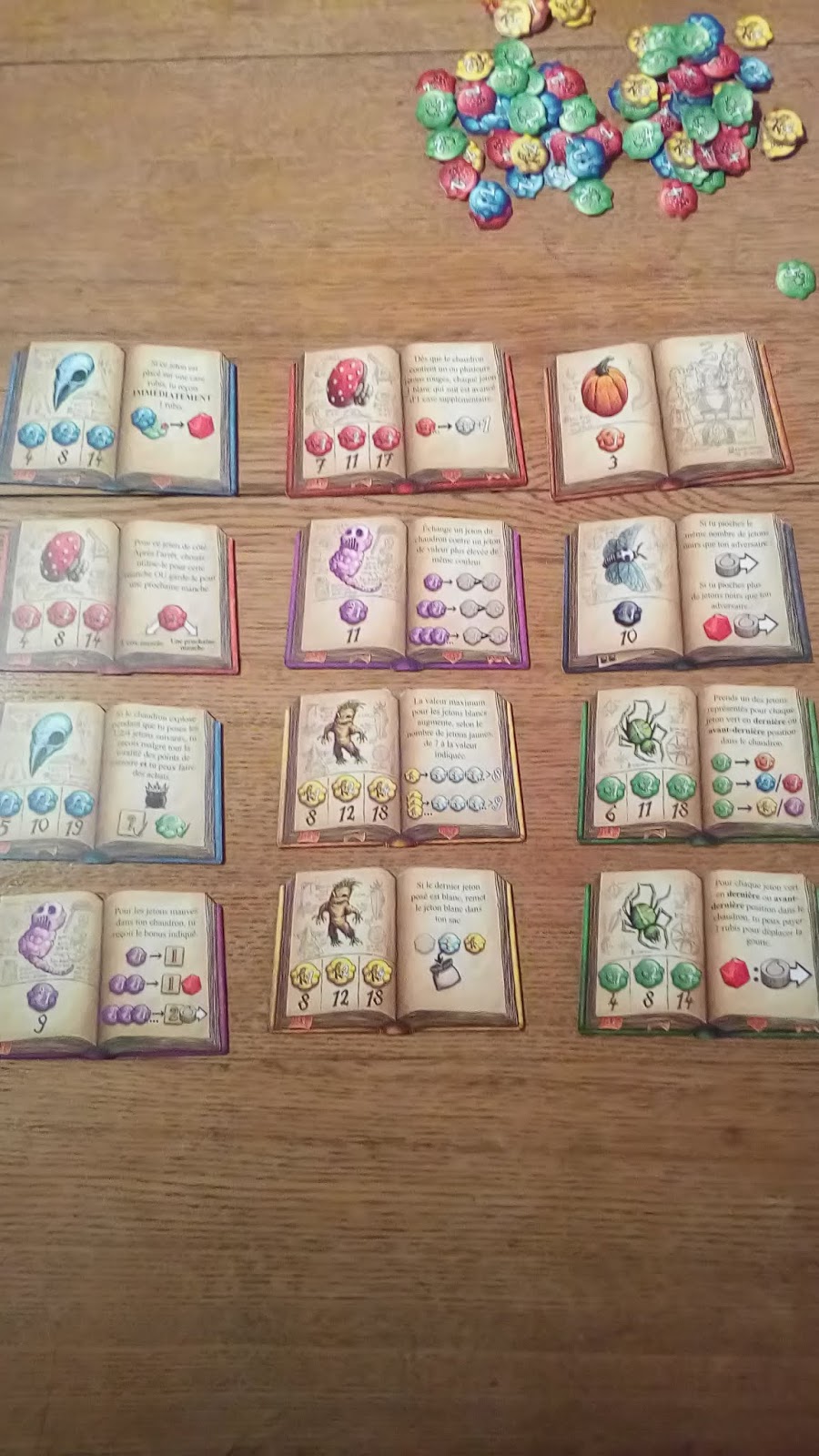 Nous voilà prêts à débuter notre partie (un plateau central, des livres de sorts et des stocks d’ingrédients ont été placés au centre la table mais nous y reviendrons un peu plus loin).