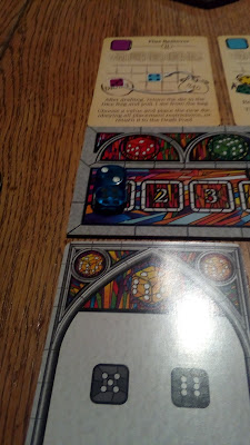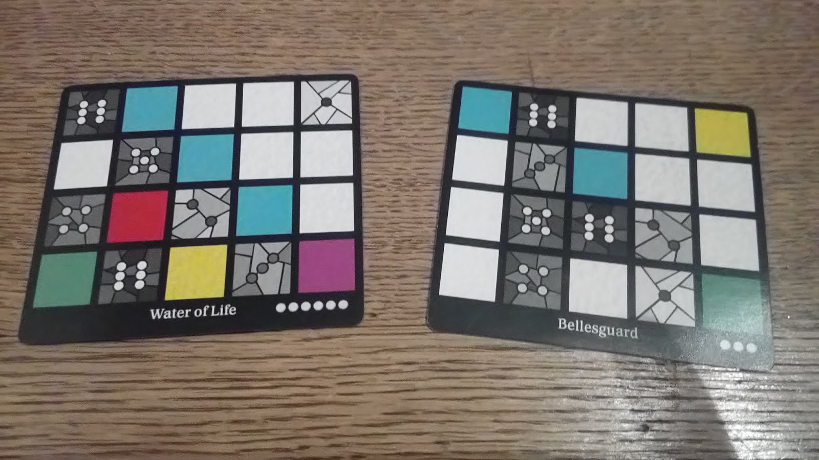 En outre, chaque joueur reçoit un encadrement pour son vitrail, un objectif qui lui est propre (et qui restera secret) ainsi que deux cartes recto-verso aux noms évocateurs parmi lesquelles nous pourront choisir le vitrail nous inspirant le plus. Parmi ces deux cartes, il faudra choisir celle qui servira de base à notre travail. La face choisie sera à insérer dans notre encadrement. L’autre carte sera simplement défaussée.