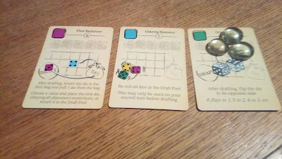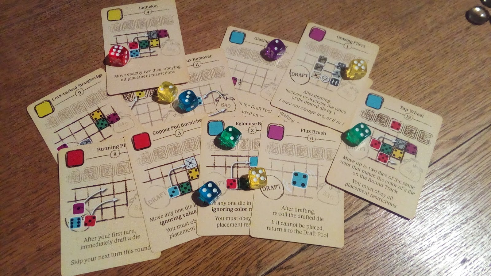 Il y a 3 outils disponibles lors de chaque partie (parmi un vaste choix). Ceux-ci peuvent être activés pour bénéficier d’une aide, souvent bienvenue. Les effets, sont divers, mais il permettent par exemple, de changer la valeur d’un dé, de relancer le dé choisit, déplacer un dé de notre vitrail sans tenir compte de certaines contraintes, etc. C’est toujours très intéressant, mais ils ne sont pas gratuits ! Chacun à reçu des jetons faveurs en début de partie, on va pouvoir s’en servir pour activer les outils : pendant notre tour, on va placer une faveur sur la carte de l’outil si celui-ci n’a jamais été utilisé.