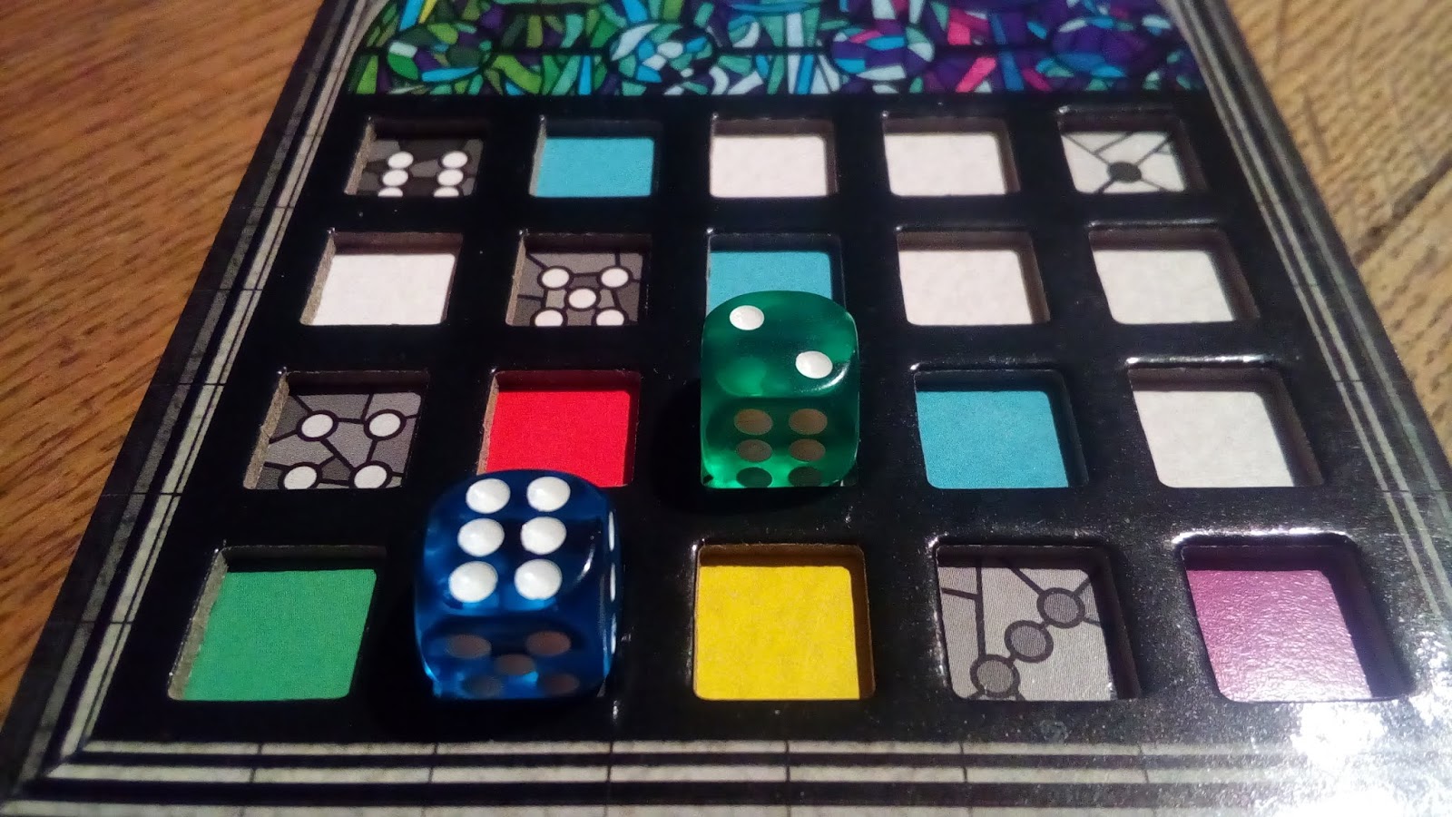 – Chaque dé placé doit impérativement être en contact avec au moins un autre dé (ce peut être en diagonale). La seule exception à ceci étant pour le premier dé, qui devra se trouver sur un des 14 emplacement de la périphérie de notre vitrail.