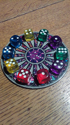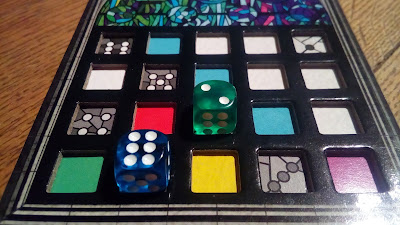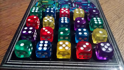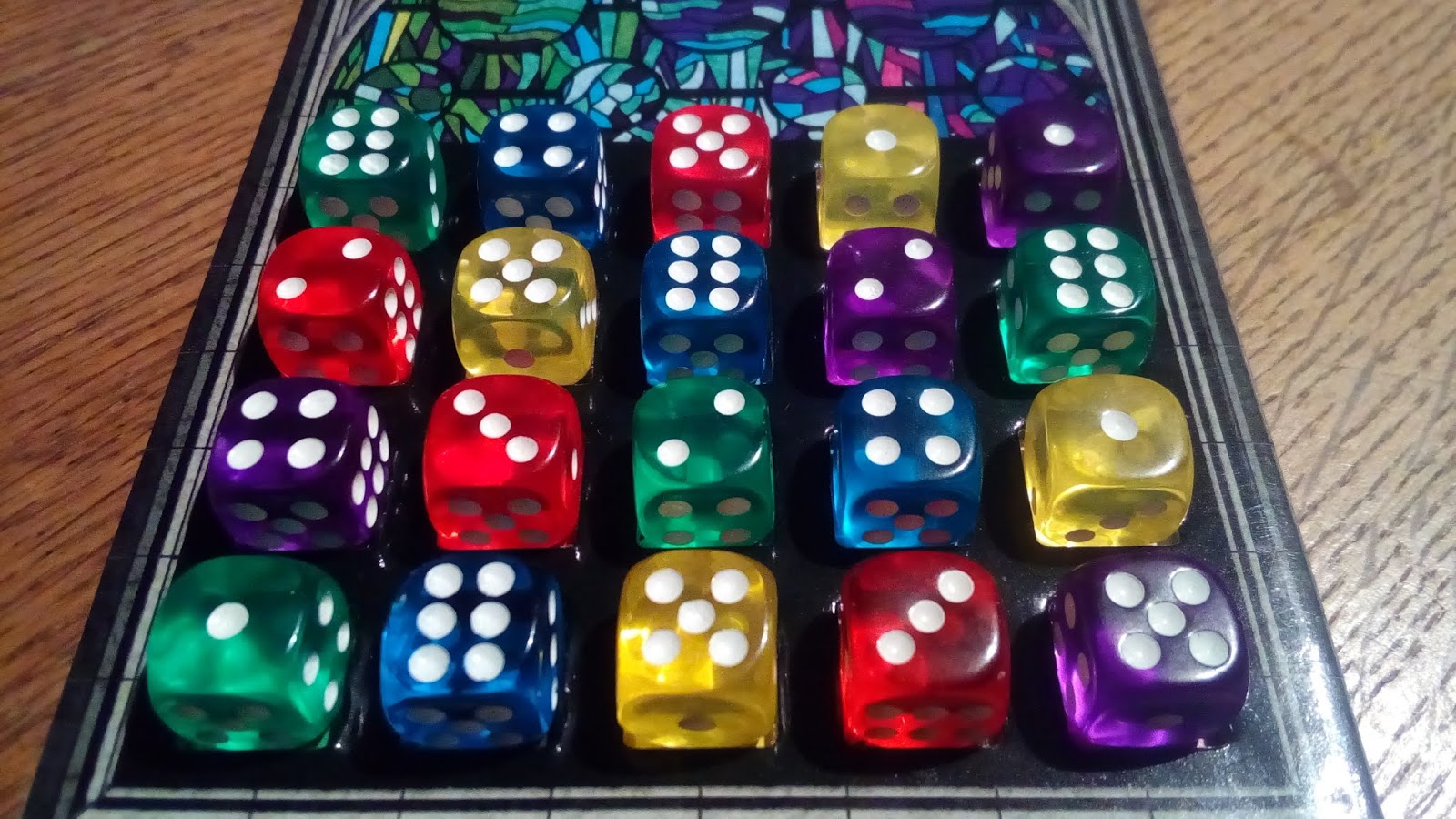 # un sac opaque rempli de dés : il y en a 18 de chacune des 5 couleurs (vert, bleu, mauve, jaune et rouge), pour un total de 90 dés. Ce sont eux que l’on placera afin de constituer notre vitrail.