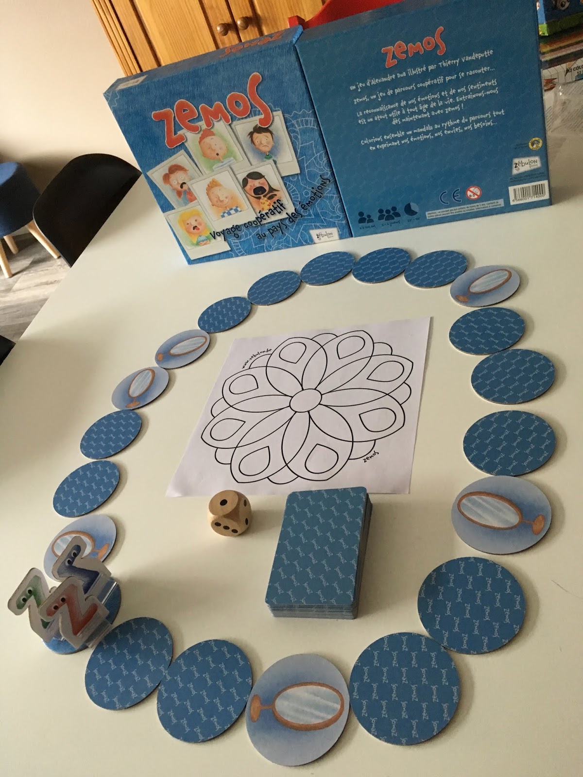 Jouer à Zemos avec vos enfants, c’est l’occasion de les faire parler d’eux, de leurs peurs, leurs envies, leurs souvenirs, mais aussi de partager les vôtres avec eux, tout ça sous forme de jeu. Atypique grâce à ses mandalas à colorier qui serviront à définir le timing de la partie mais aussi à créer quelque chose avec votre petit. Peut-être que les sentiments qu’il partagera définira les couleurs qu’il utilisera… Peut-être découvrirez-vous des choses que vous ne soupçonnez pas…