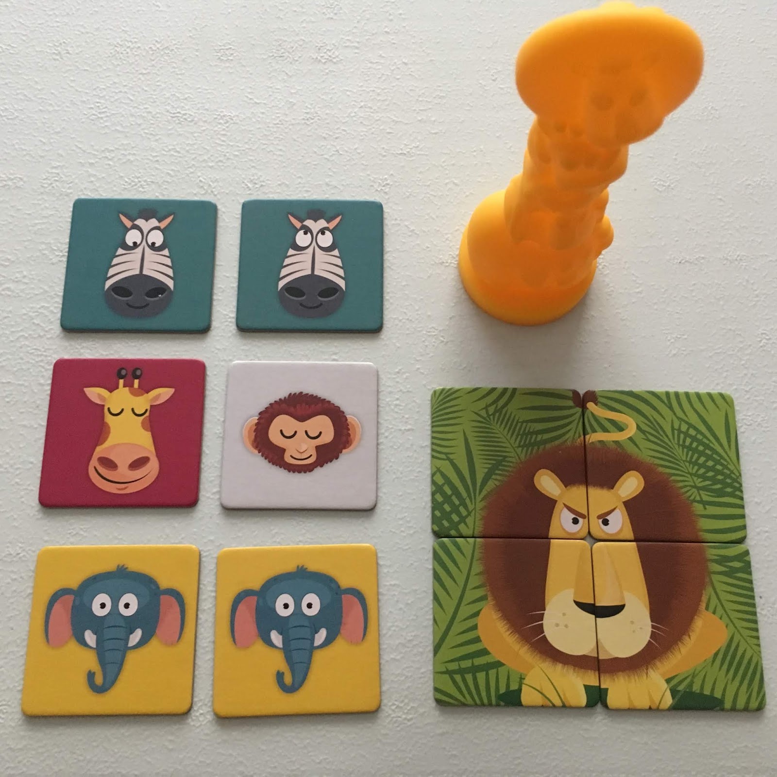 On place 32 tuiles animales face cachée autour du totem. Chaque joueur reçoit une carte personnage. Le plus jeune commence. Il va falloir constituer des paires d’animaux identiques. A son tour, un joueur retourne une carte face visible pour que chacun en prenne connaissance. Dès lors, n’importe quel joueur peut se saisir du totem s’il pense savoir où se cache un animal correspondant. On dévoile la carte et si il y a paire, le joueur s’empare de la carte. Si pas, son personnage est figé (retourné sur l’autre face). Il pourra revenir en jeu la prochaine fois que ça sera son tour mais d’ici là, il ne pourra pas participer au jeu (sauf si une carte lion apparait). En parlant du lion, 4 cartes lions se cachent parmi les cartes animaux. Dès que les 4 sont révélées, le jeu prend fin. Celui qui a le plus de cartes l’emporte.