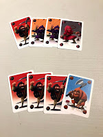 Le jeu se compose de 8 familles de cartes, 4 mêmes cartes par famille. Les personnages et couleurs de chaque famille sont différentes. Prenez autant de familles de cartes que de joueurs, mélangez-les et distribuez-en 4 à chaque joueur.