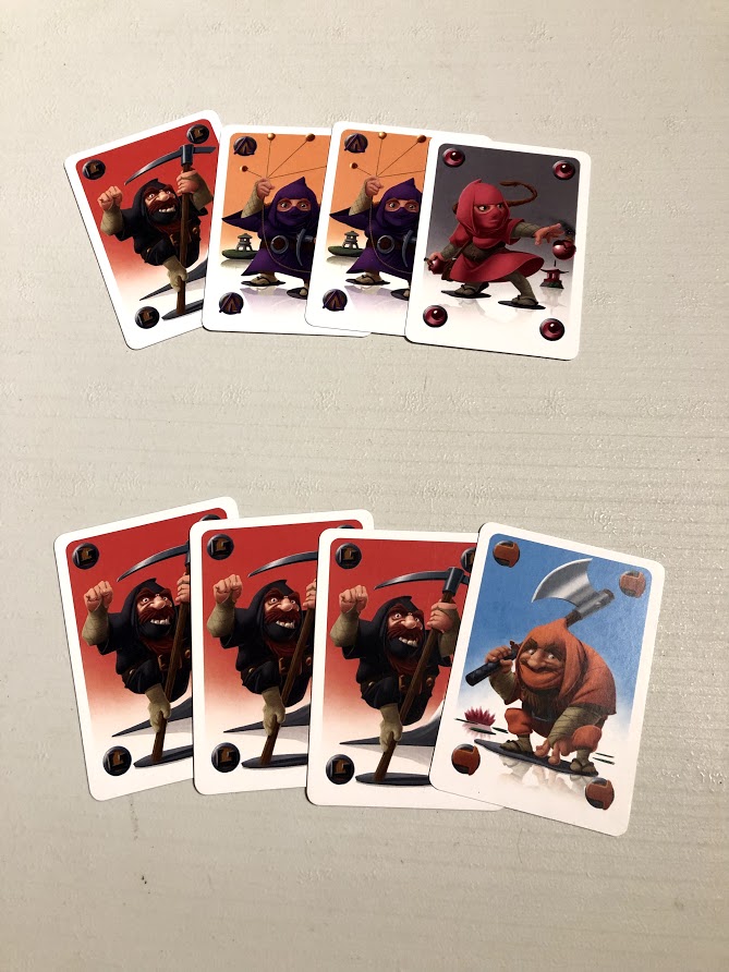 – A eux deux, une équipe réunit 4 cartes de la même couleur, et tape sur le Gong en « criant » Ninjaaa ! Ceux-ci révèlent alors leurs cartes, ils obtiendront le jeton de la couleur correspondante (voir exemple à droite, ils prendront alors un jeton rouge).
