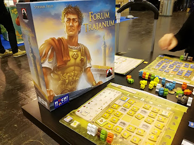 Première grosse grosse impression du salon. Explications simples et aux petits oignons, il ne m’en fallait pas plus pour me lever et aller acheter une boîte. Première vraie partie effectuée le soir-même et sentiment concrétisé : excellent jeu de Mr Feld, même si il n’y pas de nouveautés à l’horizon mais le tout s’imbrique très bien. En résumé, en début, on tire 2 cartes indiquant dans quelles rues de votre plateau vous pourrez choisir 2 citoyens, ensuite, vous devez en donner un à votre voisin et vice-versa. A votre tour, vous choisirez quelle tuile vous activerez, ceci est suivie d’une phase de construction et potentiellement, vous pourrez envoyer vos cityoens au forum. Tous ces choix impliquent des gains en points de victoire d’une manière ou d’une autre.
