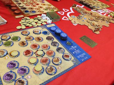 Excellente et superbe partie réalisée en très bonne compagnie. On en est parti sous le charme. Peut-être un peu trop, du coup, on est retourné quelques jours plus tard pour retester plus sérieusement le jeu et oui, le jeu est excellent mais j’ai peur qu’on en fasse vite le tour. A son tour, on choisit une tuile et on la pose façon « domino », ce qui nous rapporte des ressources avec lesquelles on achète et on complète des magasins afin de gagner des points de victoire. Il y a également la possibilité de construire des édifices sur le plateau si vos adversaires sont gentils ou distraits.