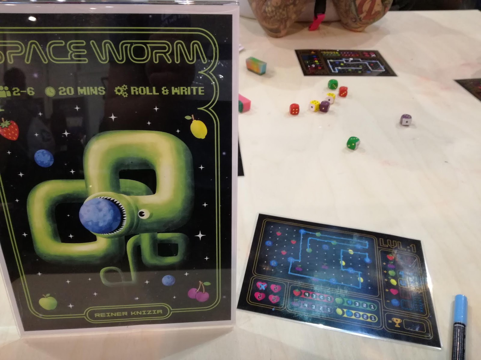 J’entraîne ma comparse pour le dernier-né de Kane Klenko (Fuse, entre autres) et oulà, première rencontre très désagréable avec nos voisins allemands. Clairement, ils n’avaient pas envie de jouer avec nous et encore moins en anglais. Bref, la partie s’écourte assez vite et c’est bien dommage car on a de nouveau droit à un bon jeu de pose de tuiles en temps réel (avec du draft) où il faudra réaliser des galaxies de différentes couleurs avec des twists connus et bien intégrés (à nouveau) mais vraiment très très agréable et j’ai hâte d’y rejouer.