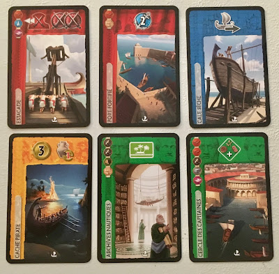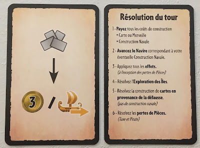 A la place de construire une carte, un joueur peut défausser celle-ci pour obtenir 3 pièces ou pour avancer gratuitement son navire Jaune d’une case (sans payer le coût de la construction navale).