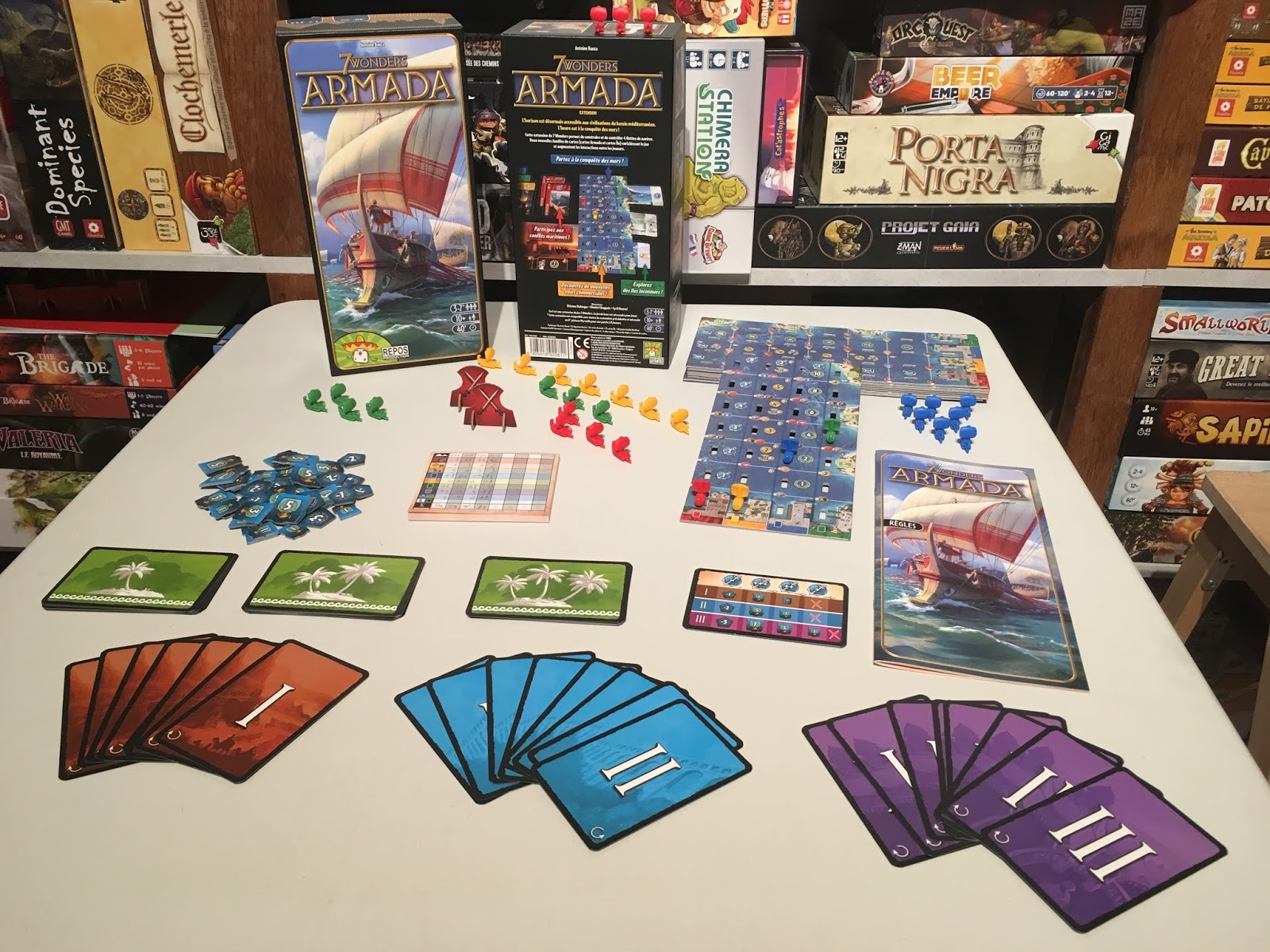 Cette extension va donc vous permettre de construire et des contrôler 4 flottes de navires. Et d’ainsi partir à la conquête des mers. De nouvelles cartes « Armada » et « Île » enrichissent le jeu et augmentent l’interaction entre les joueurs. Ce qui donne des parties au déroulement légèrement modifié mais les conditions de victoire restent identiques au jeu de base.