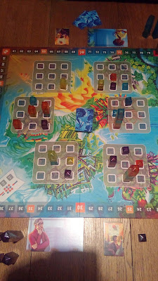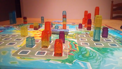 Alors tout d’abord, le matériel ! L’illustration de la boîte a été refaite, le plateau a prit de belles couleurs et la piste de score est bien plus agréable que sur l’ancienne version. Les différents blocs « Etage » aussi ont pris un coup de jeune, ceux-ci sont désormais transparents, donnant de beaux reflets si l’on joue au soleil. Les illustrations des cartes ont bien évidemment aussi été refaites.
