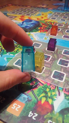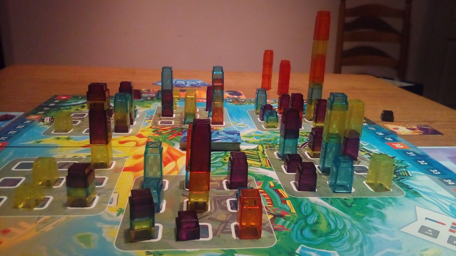 Alors tout d’abord, le matériel ! L’illustration de la boîte a été refaite, le plateau a prit de belles couleurs et la piste de score est bien plus agréable que sur l’ancienne version. Les différents blocs « Etage » aussi ont pris un coup de jeune, ceux-ci sont désormais transparents, donnant de beaux reflets si l’on joue au soleil. Les illustrations des cartes ont bien évidemment aussi été refaites.