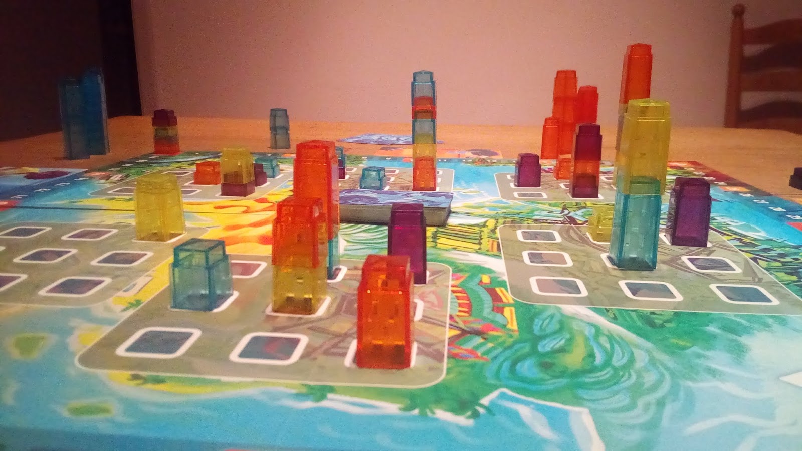Je n’avais encore jamais joué à Manhattan et la découverte était agréable. Le matériel est coloré et chaleureux, le jeu est fluide et on doit sans cesse s’adapter à ce que font les adversaires. Avec des règles simples, il est très accessible pour un public familial et peut-être sorti facilement. Même s’il est un peu trop répétitif à mon goût, je trouve que c’est un jeu dont on veut toujours bien faire une partie lorsqu’on nous le propose ! Et comme mentionné plus haut, y jouer dehors au soleil permet de mettre au mieux le matériel en valeur, la lumière passant à travers nos immeubles se reflétant sur le plateau. Seul petit bémol, les règles laisse parfois planer un léger doute sur ce que l’on peut faire (notamment pour pour placer un bloc par dessus un autre) mais elle sont bien assez digeste pour que cela n’empêche pas de se lancer rapidement dans une première partie, une fois. Et le fait d’avoir ajouté des cartes supplémentaires permet un renouvellement des parties et des stratégies jusque là absents.