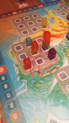 Ici le jaune peut construire car cela lui fait un total de 4 étages, contre 3 pour le bleu |