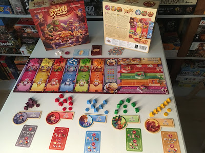1 plateau de jeu, 5 plateaux individuels, 30 commis de cuisine, 10 disques spéciaux, 1 carte premier joueur, 14 cartes événement, 5 aides de jeu, 3 dés, 3 tuiles blocage, 34 plats de 6 catégories, 24 jetons points de victoire (1, 2 ou 5PV) et 90 ingrédients (cubes de 7 couleurs).