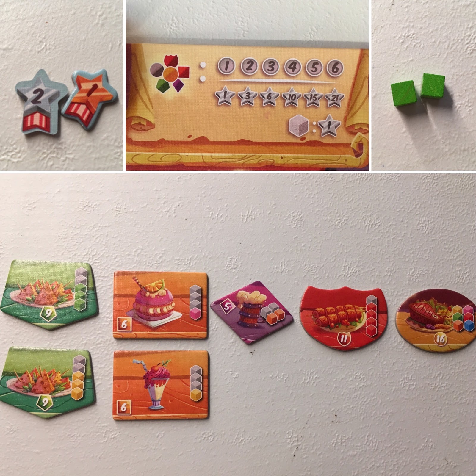Chaque plat comporte un nombre de cubes d’une couleur déterminée que vous devez défausser et il est accompagné d’un nombre de cubes dont vous choisissez la couleur (ils doivent cependant être tous de la même couleur). Si vous cuisinez un plat de la colonne 2 ou 3, vous devrez de plus dépenser 1 ou 2 ingrédients supplémentaires d’une des 2 couleurs déjà utilisées pour préparer ce plat.