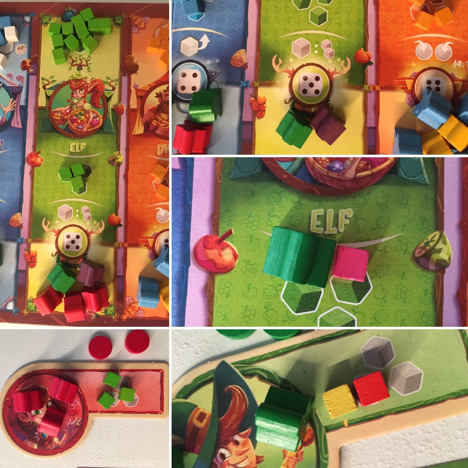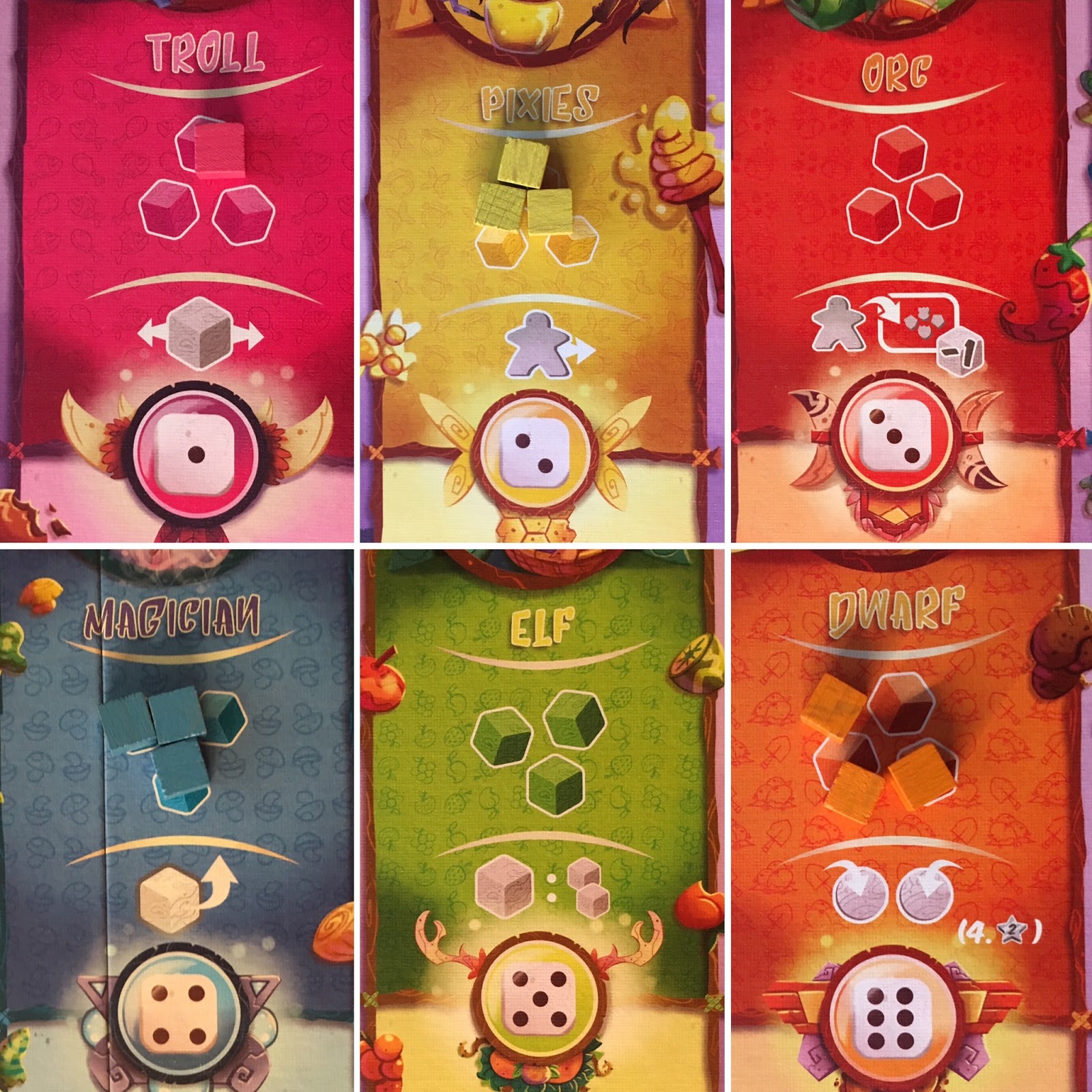 Mais avant tout, ils devront collecter les meilleurs ingrédients pour leurs plus grands plats. Inutile de préciser que c’est la foire d’empoigne au marché, et tous les habitants du royaume ont fait le déplacement vers la capitale dans le but de vendre leurs ingrédients les plus précieux. Le troll apportera les viandes les plus délicieuses, les pixies vendent du miel de la couleur de l’ambre (volé, sans aucun doute), l’orque apportera les meilleures épices venues du Sud, le magicien sort de la forêt enchantée en de très rares occasions, amenant des tas de champignons, l’elfe, vient avec des tonnes de fruits juteux et enfin, le nain apportera les patates, nécessaires à tout plat qui se respecte.