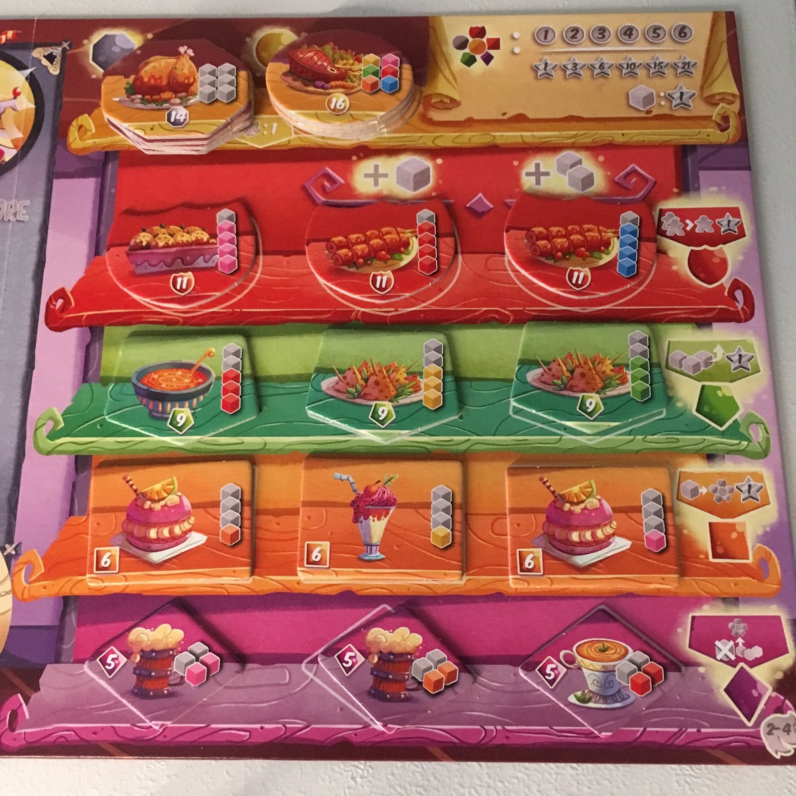 Au niveau du buffet, s’il y a des trous dans une rangée de plats, glissez ceux restant vers la gauche et remplissez les emplacements vides avec la pioche. Les 2 plats spéciaux (rôti et plat principal) ne sont jamais remplis.