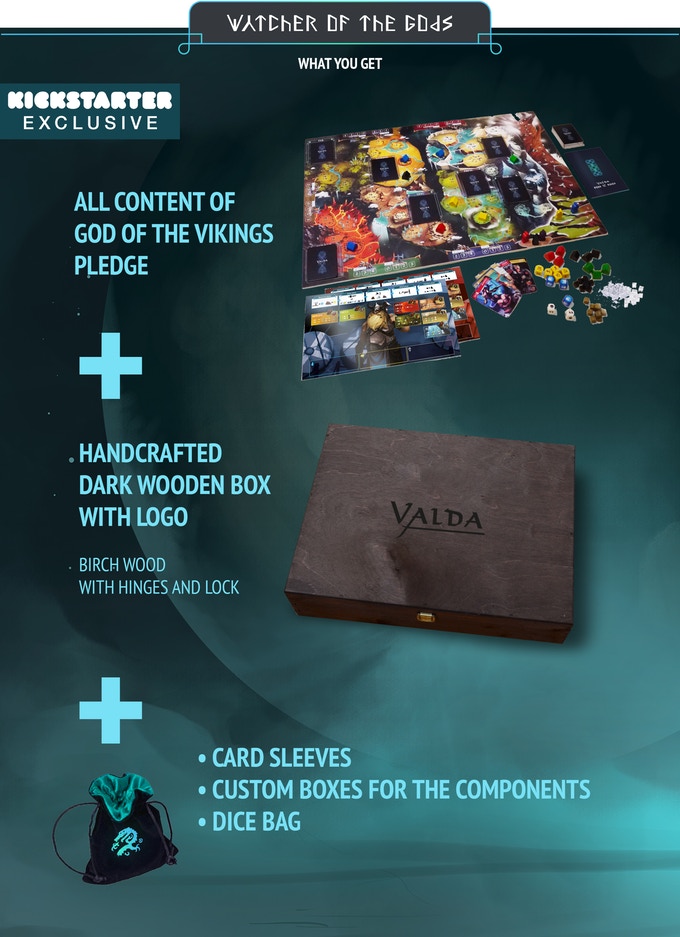 Plusieurs types de pledges sont disponibles, la boîte de base revient à 49 euros et on retiendra principalement celui à 74 euros qui vous permettra de récupérer le jeu dans une superbe boîte en bois faite main…ce qui, en gros, sera la version deluxe. Le tout livré aux alentours d’avril 2019.